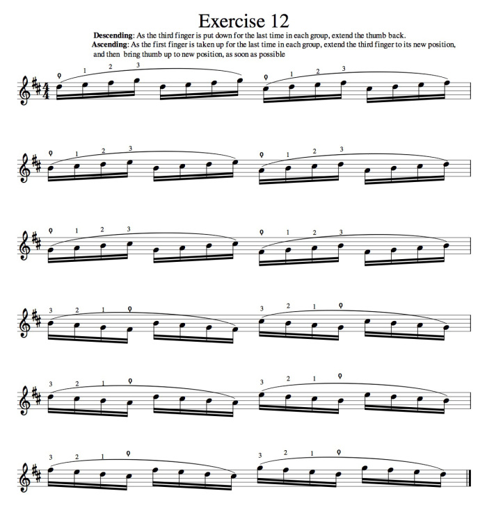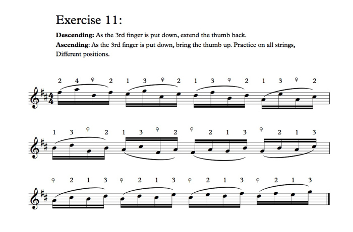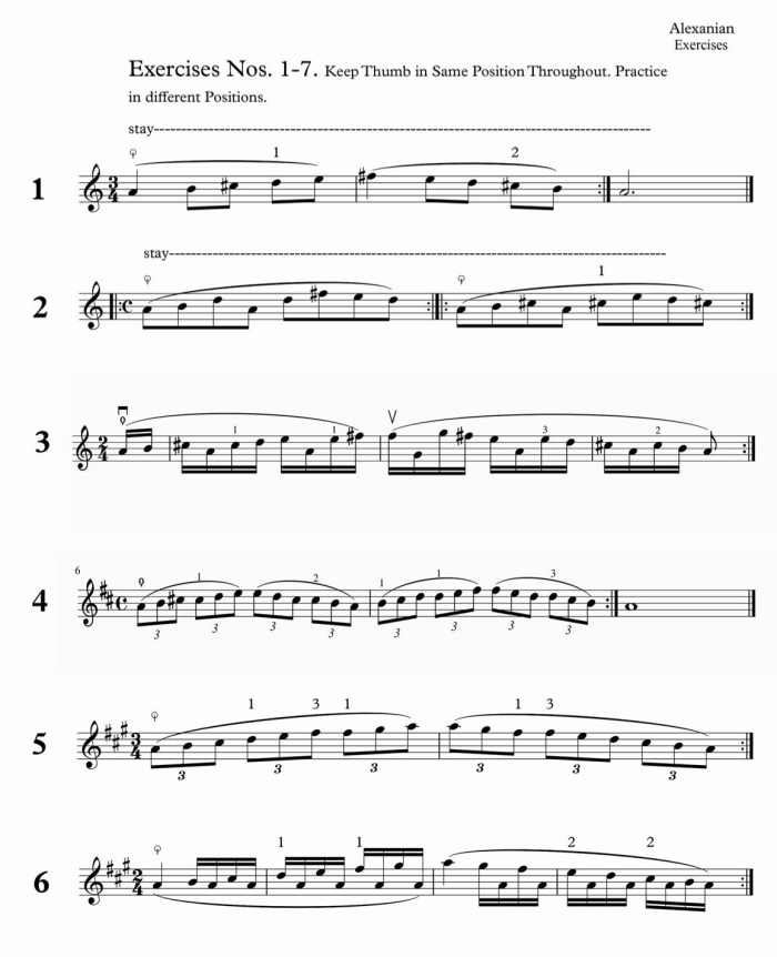 Hoy hablaremos de algunos ejercicios de posición de pulgar de Diran Alexanian, que mi profesor en Freiburg, el español (catalán, nota del traductor) Marçal Cervera me dio en 1972. Estos ejercicios no están incluidos en el principal libro de técnica de Alexanian, Traite Theorique et Pratique du Violoncelle (Tratado teórico y práctico del violonchelo) El libro de Alexanian incluye varias páginas de otros ejercicios de pulgar (paginas 125 en adelante) los cuales son buenos para practicar, pero creo que estos 13 ejercicios nunca han sido publicados antes. No se cómo Cervera consiguió estos ejercicios, pero los copié de su cuaderno, y los estudié con el. Los encuentro muy útiles.